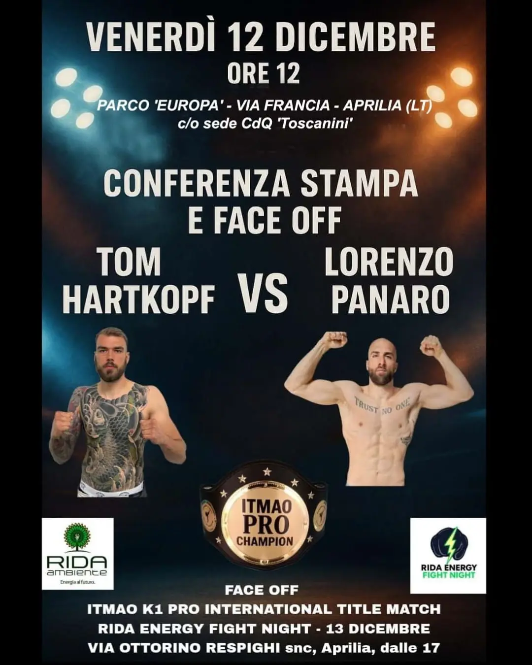 Tutto pronto per la Conferenza Stampa e Face Off tra Tom Hartkopf e Lorenzo Panaro, protagonisti dell’ITMAO K1 Pro International Title Match al RIDA ENERGY FIGHT NIGHT del 13 Dicembre.