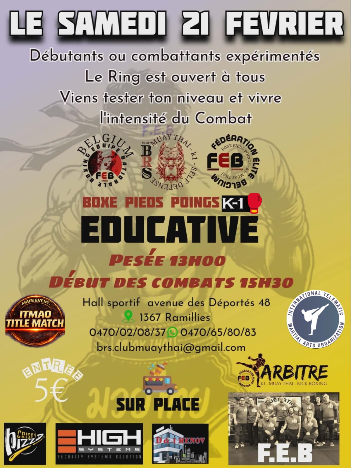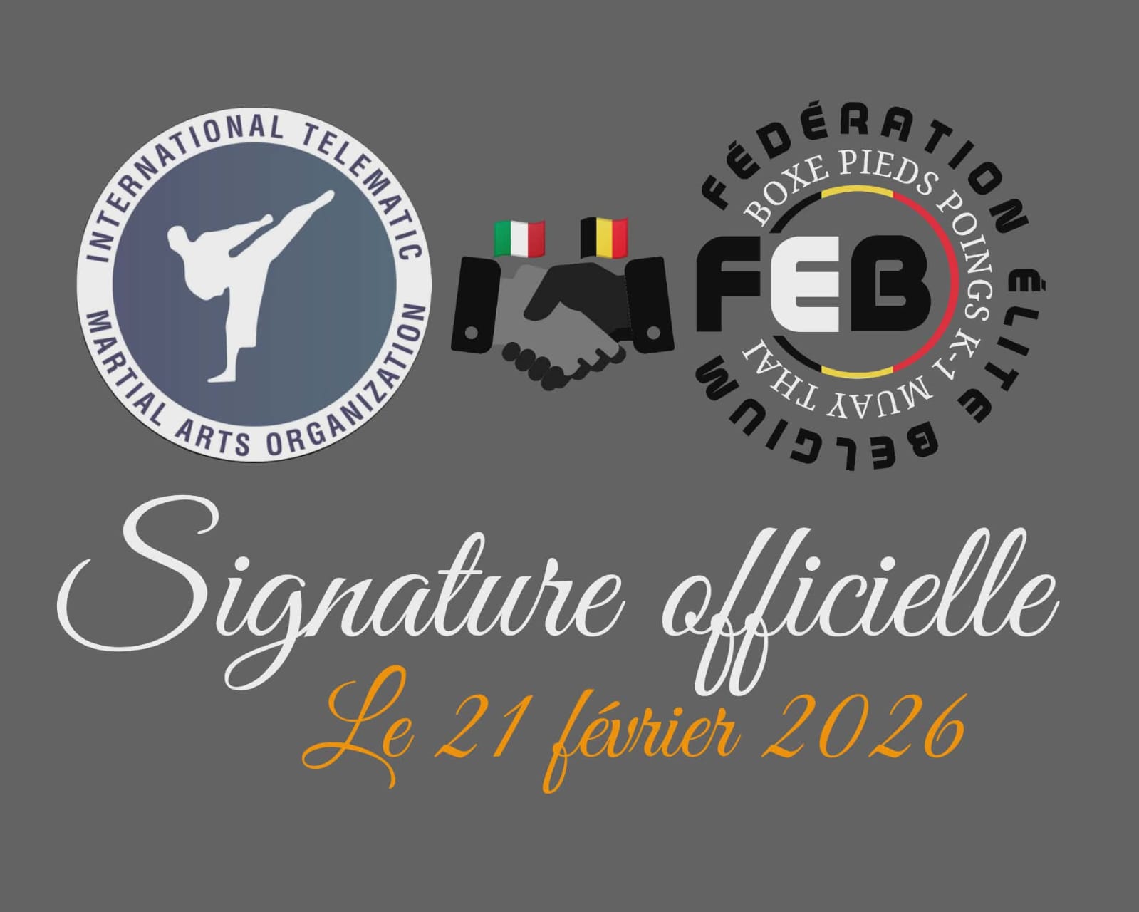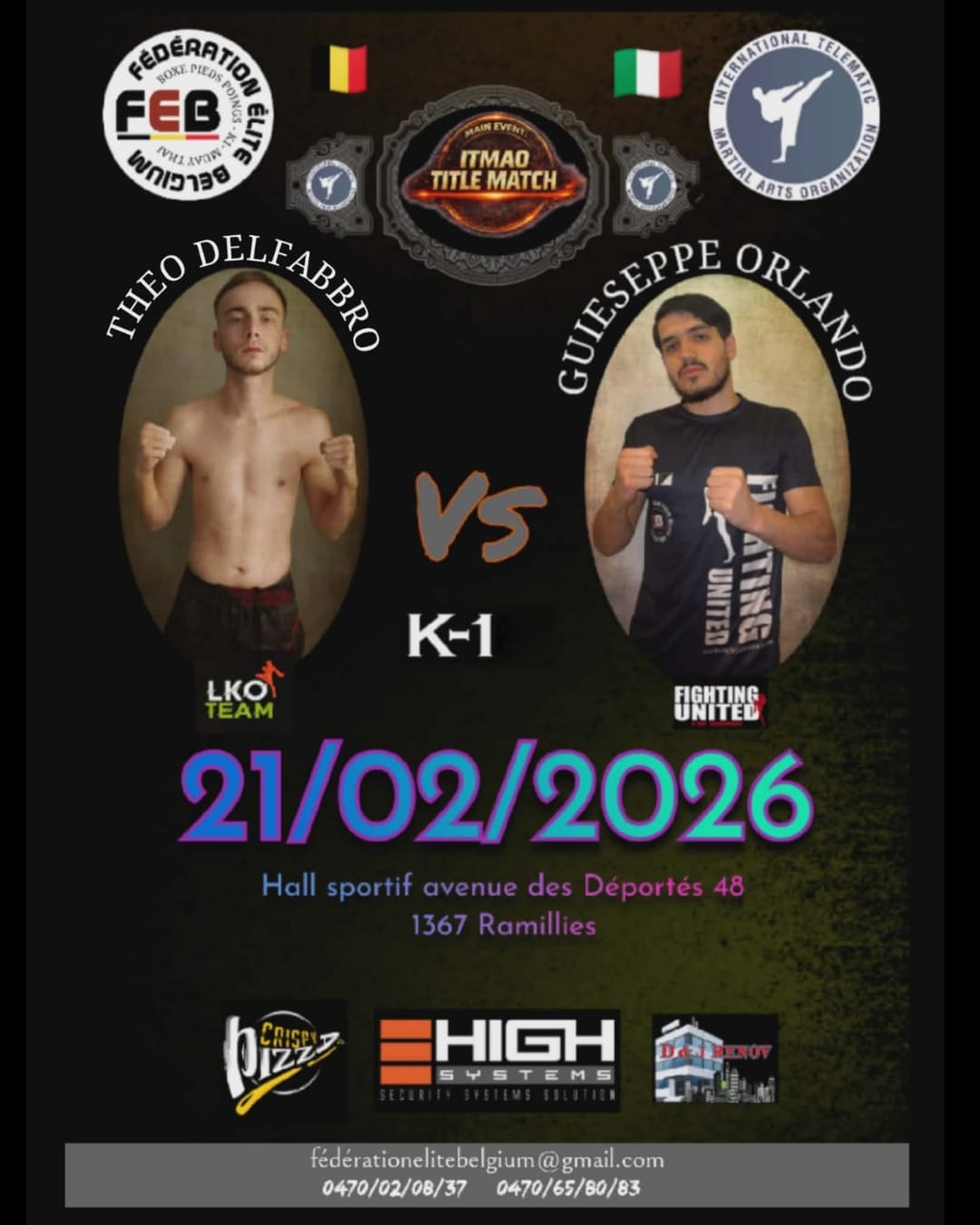 Event organized by FEB- Fédération Elite Belgium, featuring an ITMAO Title Match sanctioned by the International Telematic Martial Arts Organization.